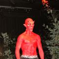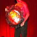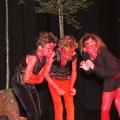 Der Teufel (Fabian Urban) ist wütend. Die Kobolde haben sein Machtinstrument, den Spiegel, zerbrochen und müssen nun die Scherben suchen. Die letzte Scherbe aber steckt in Kays Auge. Die frechen Hexen (r.) freut es, dass der Teufel seine Macht eingebüßt hat. Links im Bühnenvordergrund ist das Reich des Teufels aufgebaut, am rechten Bühnenrand der Hexenkessel.